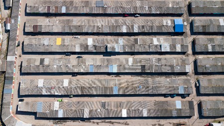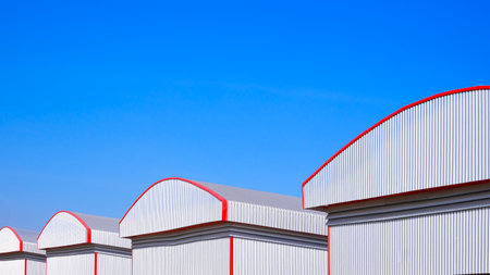 Row of rental warehouse industrial factory buildings group with dome roof and aluminum corrugated steel wall against blue sky background, perspective side view with copy space