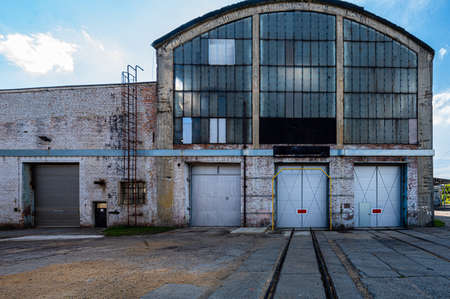 Ruined industrial hall of warehouse or hangar in process of reconstruction, toned
