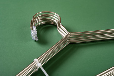 angle view bunch of stainless steel hangers on a green background