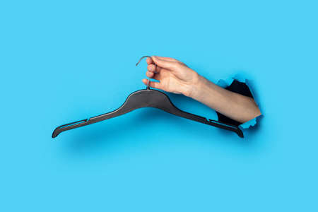 Female hand on a blue background holding a black plastic clothes hanger