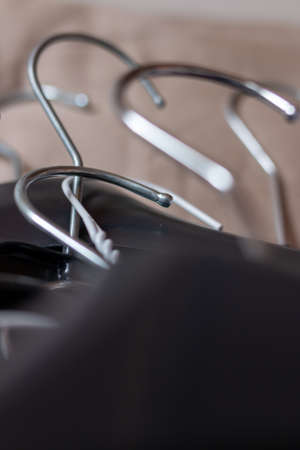 Metal clothes hanger, warm light, close-up. Fashion concept, wardrobe. High quality photo
