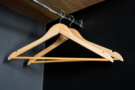 A high-contrast shot of shadowed hangers in an open wardrobe with dramatic lighting.