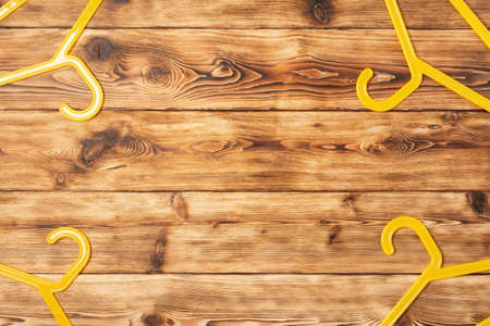 Creative top view flat lay white wooden hangers isolated bold yellow background with copy space minimalism style. Template fashion feminine blog social media sale store promo design shopping concept