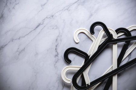 lot of plastic black hangers on the bar. Concept store, sale, design, empty hangers.