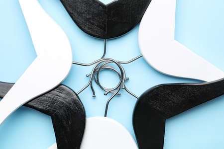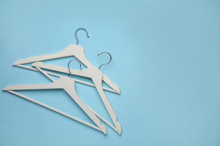 Empty clothes hangers on light blue background, flat lay. Space for text
