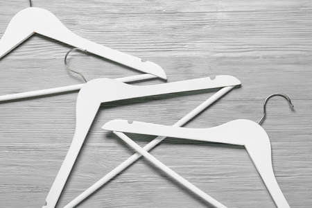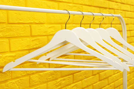 Clothes rail with hangers on blurred wooden background. Close up. Selective focus