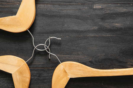 Black Friday or clothing industry concept on gray background flat lay with straight folded wooden clothes hangers