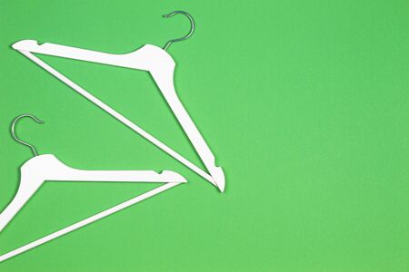 Two white wooden hangers on pastel green background. Shopping, sale, promo, social media, new season concept