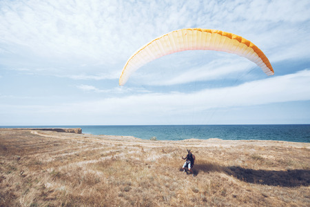 paragliders tandem at the start, sky divers training by the sea shore