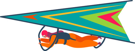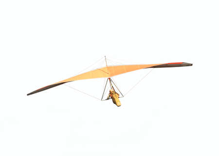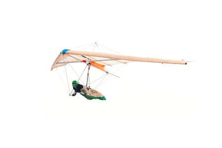 Hang glider is soaring in a gliding flight, hanging on a harness below the wing, isolated on white background