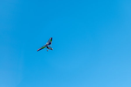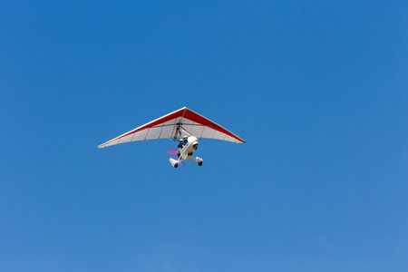 Motorized deltaplan flying in the air with beautiful blue sky on the background