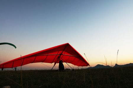 Hang-glider silhouette in sky in sunset time