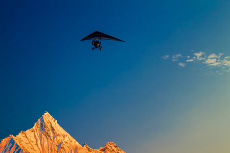 Ultralight aircraft and trees and snowcapped peak at background in the Himalaya mountains, Nepal