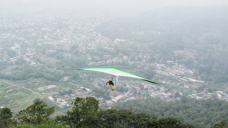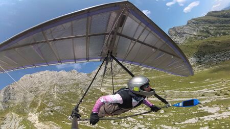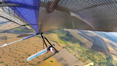 Fearless hang glider pilot fly high above terrain. Photo from the wing