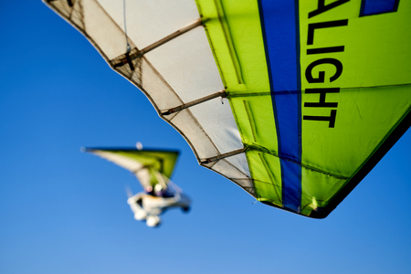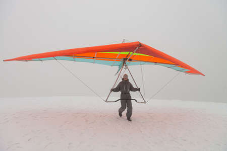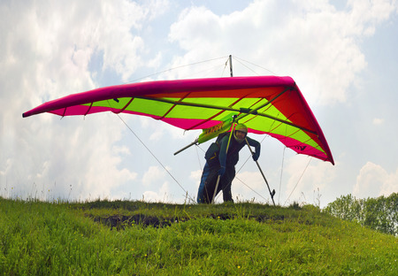 Ukraine. Hang glider pilot fly his bright kite wing. Learning extreme sports