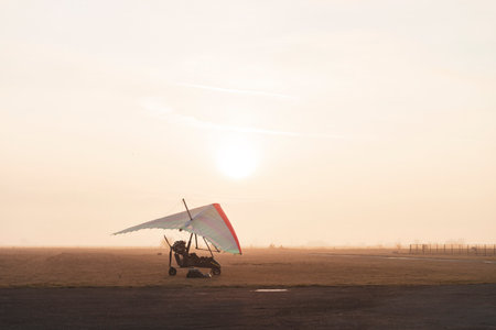 Motorized hang glider trike on the runway in the early morning. Moody aviation photo