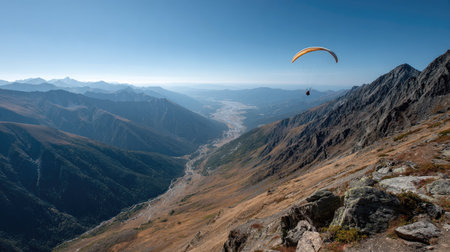 Majestic scene of a paraglider soaring above rugged mountains, showcasing the thrill of adventure sports amidst a breathtaking nature backdrop.