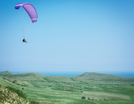 Paraglider flying over mountains and sea in summer day