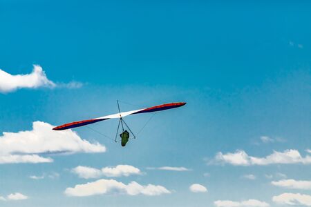 Hang glider flying in the blue sky on a sunny day