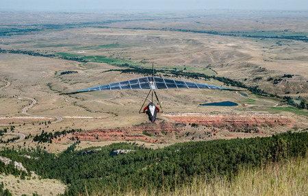 Hang Gliding in Wyoming: A glider sails over the landscape of northeast Wyoming after launching from a roadside cliff in the Big Horn Mountains.