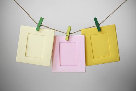 Empty colorful photo frames hanging on rope with pin.