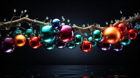 Colorful christmas ornaments hanging on a branch on black background