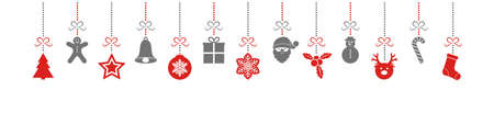 A cheerful arrangement of red and white Christmas ornaments including stars, a ball, and a tree, strung with a matching garland on a clean white backdrop.
