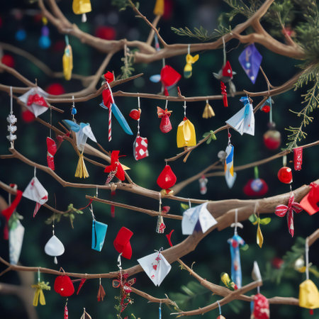 A collection of colorful glittering ornaments sway gently in the air creating a festive and enchanting atmosphere for the holiday season.