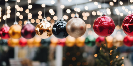Colorful Baubles and Balls hanging decorated on christmas tree with bokeh light background