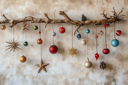 Charming wall display of wooden branches and festive ornaments infuses holiday cheer into home