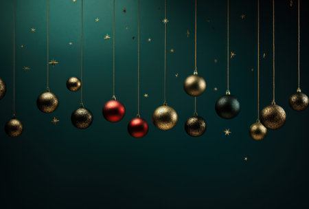 Christmas background decoration baubles balls hanging. Decorative beautiful Ball. Xmas Ornament Balls. Festive New Year template for postcard and banner design. generative ai