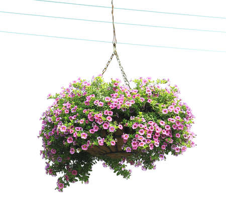 A stunning view of a lush flower basket overflowing with vibrant blooms, suspended against a bright blue sky with delicate clouds, creating a serene and picturesque outdoor scene.