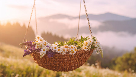Breathtaking Floral Display: Delicate Flowers Swaying on Rope Artwork - AR 3:2