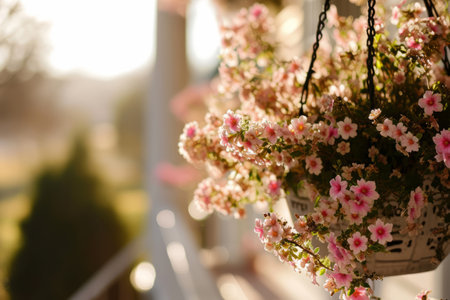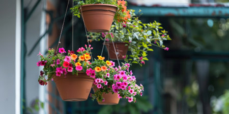 Colorful hanging flower baskets adorn a balcony, creating a vibrant and cheerful outdoor decoration. High quality photo