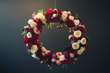 A large, round hoop decorated with rich red, burgundy, and cream flowers such as roses, peonies, and chrysanthemums, hanging on a dark grey backdrop wall, illuminated by chandelier lights. --ar 3:2 --v 6.1 Job ID: 1bf3bc69-dbf2-4335-be30-346af97e37b1
