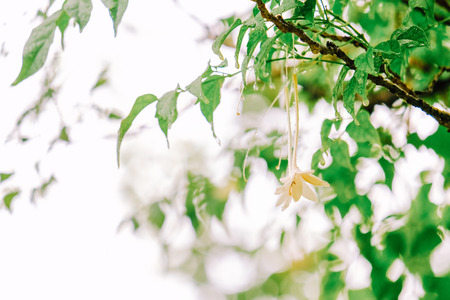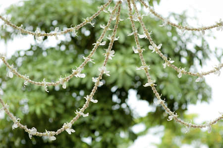 This stunning image captures the delicate beauty of white flowering plants hanging gracefully in nature, showcasing their serene charm and peaceful atmosphere.