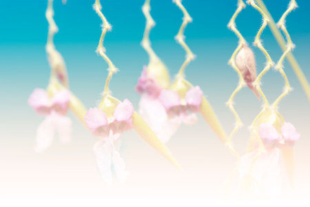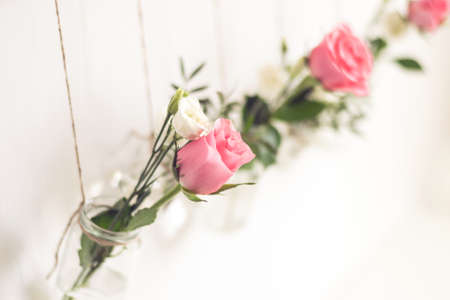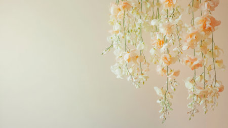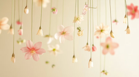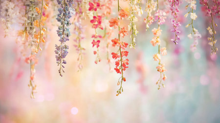 Hanging pastel flowers in soft focus, dreamy floral decor. Springtime and elegance concept