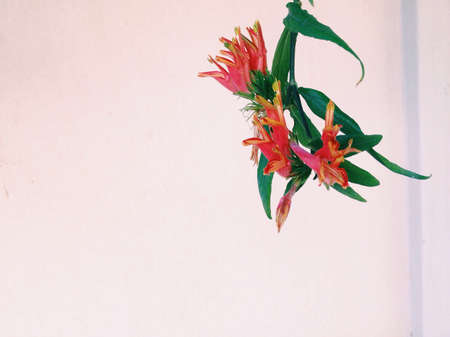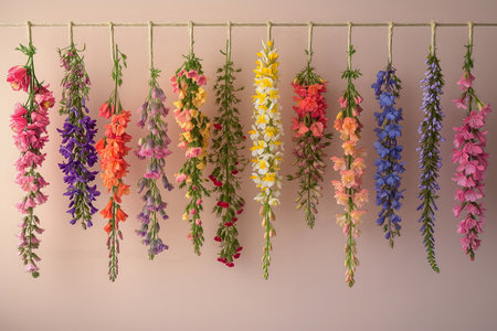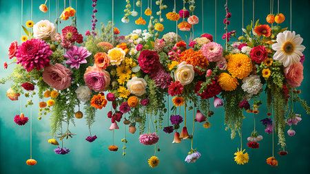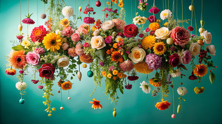 This stunning floral arrangement features a variety of colorful blooms hanging gracefully against a minimalist background, bringing a sense of elegance and beauty.