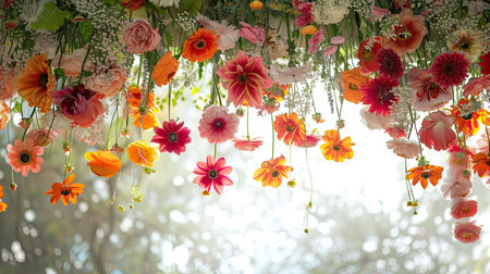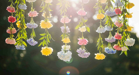 A stunning display of colorful paper flowers hanging elegantly against a soft illuminated background, perfect for enhancing event decor and sunny moods.
