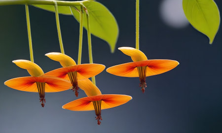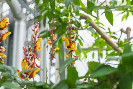 Vibrant yellow and red flowers of a hanging tropical vine in bloom.