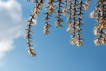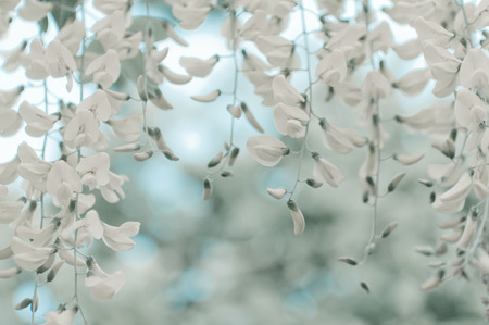 Robinia pseudoacacia tree flowers, know as black locust, white, copy space