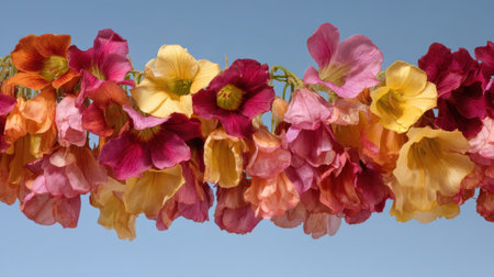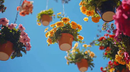 Discover the beauty of colorful hanging flower pots against a bright blue sky, creating a fresh and vibrant atmosphere perfect for seasonal decoration and outdoor inspiration.
