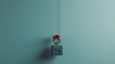 A wilted flower hangs in mid-air, held by invisible threads. A single drop of red ink falls from its petal, contrasting against the clean grey background creating a striking visual.