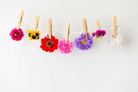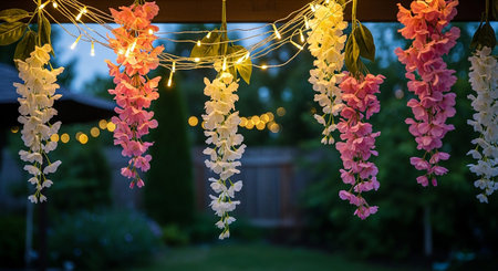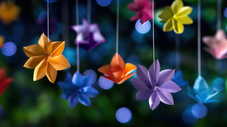 Hanging colorful paper flowers on strings, delicate and dreamy display. Creative decoration and artistic expression concept