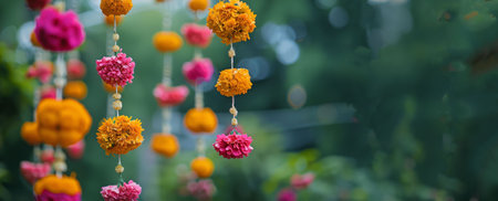 vibrant flower garlands hanging at the entrance of the Indian wedding venue. concept of colorful celebration.