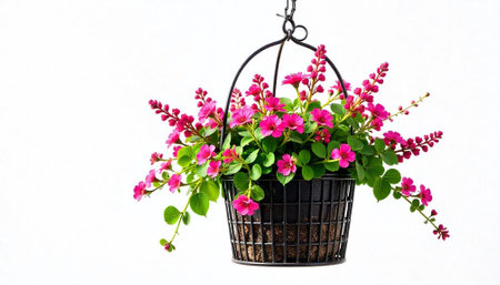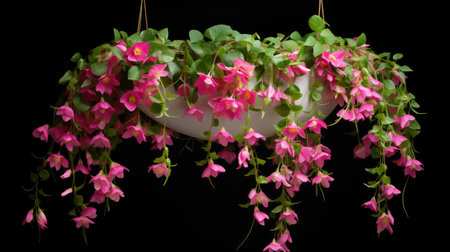 A stunning hanging pot filled with vibrant fuchsia flowers, this image captures the essence of indoor gardening and modern home decoration with elegant colors.