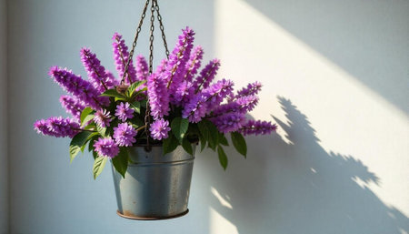 A stunning hanging floral arrangement featuring vibrant purple flowers complemented by lush greenery, perfect for enhancing any space's beauty and charm.