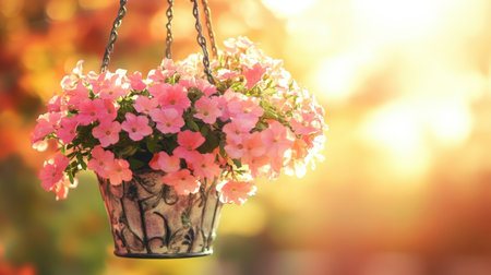 A captivating image of vibrant yellow flowers in a hanging pot, illuminated by natural light, showcasing a beautiful garden ambiance with lush greenery.