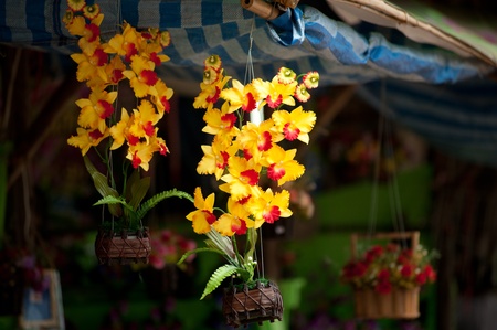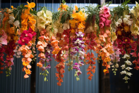 vertical image of colorful orchids hanging in a greenhouse, created with generative ai