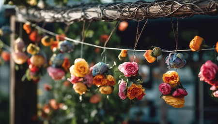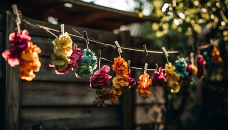 Rustic homemade decoration Multi colored clothesline outdoors generated by artificial intelligence